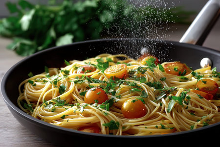 Spaghetti with cherry tomatoes and parsley in a frying pan.