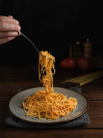 Delicious spaghetti bolognese served on a plate, with blurred and dark background. Selective focus. Hand in frame.