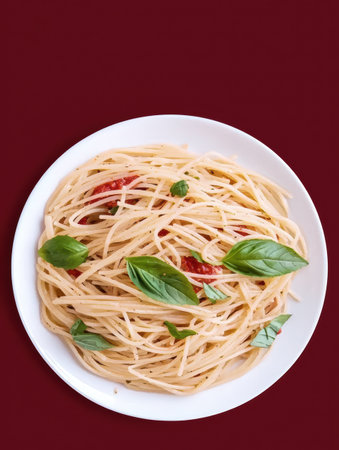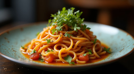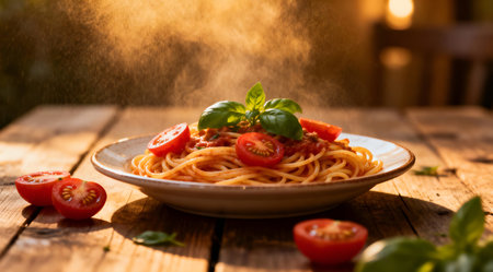 An artistic representation of a classic Italian pasta dish adorned with vibrant green basil leaves and bright red tomatoes, set on a rustic wooden table. The warm lighting enhances the inviting atmosphere, ideal for culinary blogs, restaurant menus, or food-related publications. The detailed texture of the pasta and the freshness of the ingredients are highlighted in this visually appealing composition. AI-generated illustration.