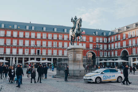 Madrid, Spain - January 26,2020: Tourists and police car by a statue of Philip III on Plaza Mayor, a major public space in the heart of Madrid, Spain.