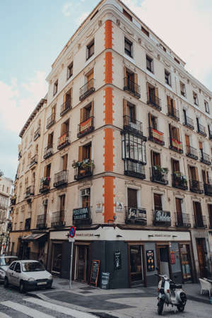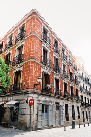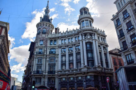Madrid, Spain - January 26, 2020: Low angle view of a traditional Spanish building on a street in Madrid, capital of Spain renowned for its rich repositories of European art.
