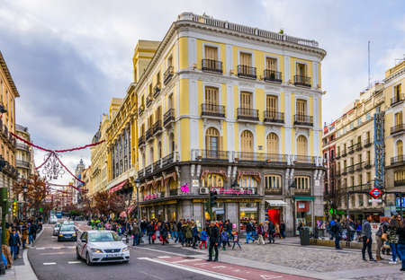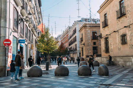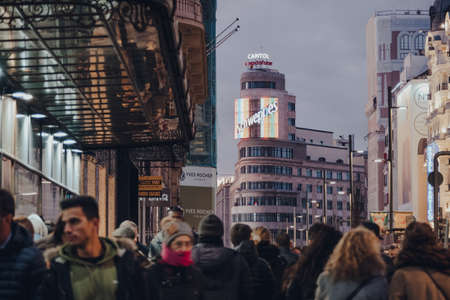 Madrid, Spain - January 26, 2020: People walking on a street in Madrid, capital of Spain renowned for its rich repositories of European art, on a sunny winter day.