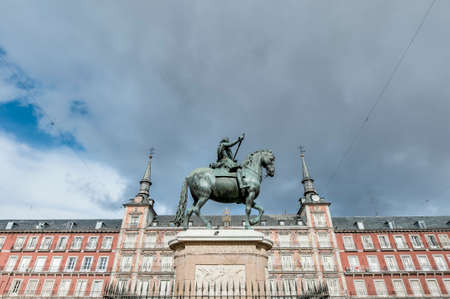 Bronze statue of King Philip III at the center of the square, created in 1616 by Jean Boulogne and Pietro Tacca on the Plaza Mayor in Madrid, Spain.