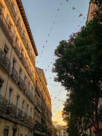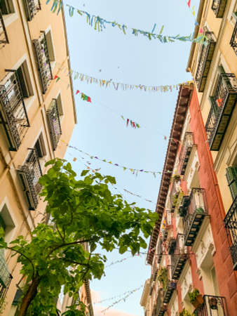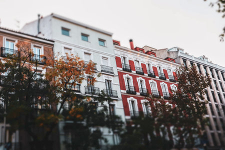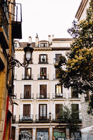 Facades of old buildings in a neighborhood of Madrid, Spain, on a sunny autumn da