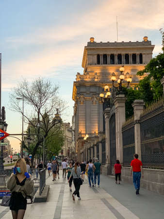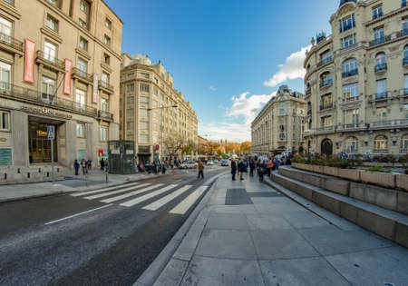 Madrid, Spain - January 26, 2020: People walking on a street in Madrid, capital of Spain renowned for its rich repositories of European art, on a bright sunny day.