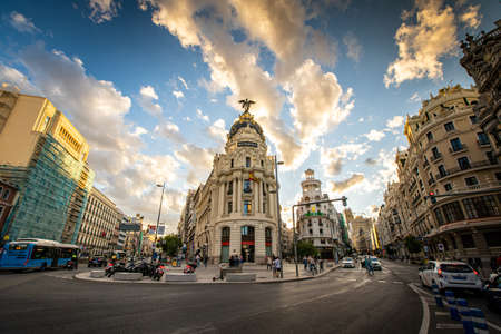 MADRID - SEPTEMBER 08: view of Gran Via street, Metropolis buiding on September 08, 2013 in Madrid, Spain. It is most important avenues at city
