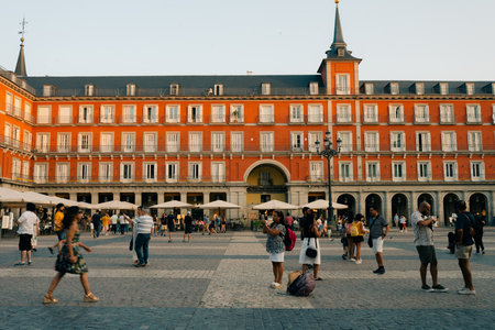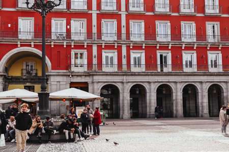 Madrid, Spain, 27 February 2024 People travelers on Plaza Mayor, Spanish capital. Red historical building facade, historical place, travel destination