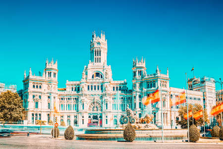 Fountain of the Goddess Cibeles (Fuente de La Diosa Cibeles) and Cibeles Center or Palace of Communication, Culture and Citizenship Centre in the Cibeles Square of Madrid.