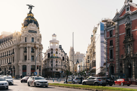Madrid, Spain - June 06, 2017 : Gran Via Street in Madrid, at day time, traffic, car on Gran Via street, main shopping and financial street in capital of Spain.