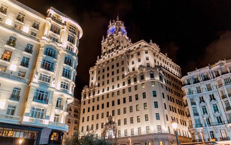 Historic buildings in Gran Via boulevard in downtown Madrid, Spain