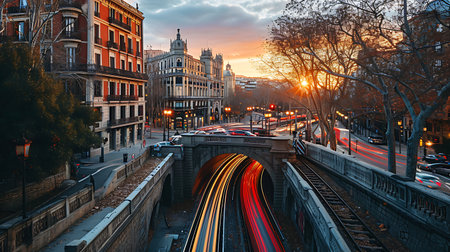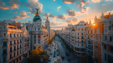 Twilight casts a serene glow over Gran Via street showcasing the iconic Madrid skyline with elegant buildings and a tranquil atmosphere