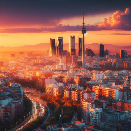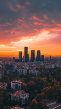 Witness the breathtaking skyline of Madrid at sunset, where Torre de Cristal and Torre de Madrid glow against a vibrant orange and pink sky, creating a stunning visual spectacle.
