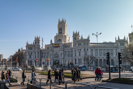 MADRID, SPAIN. JAN 2020: Tourists walking by crosswalk in front of Plaza de la Cibeles, Madrid.
