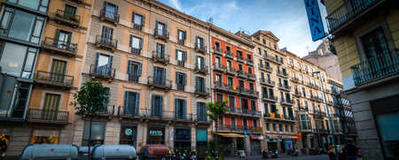 flag of the Spain on the facade of the building in the sun rays