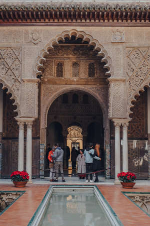 Seville, Spain - January 19, 2020: View of Patio de Maidens courtyard inside Alcazar of Seville, a royal palace built for the Christian king Peter of Castile.