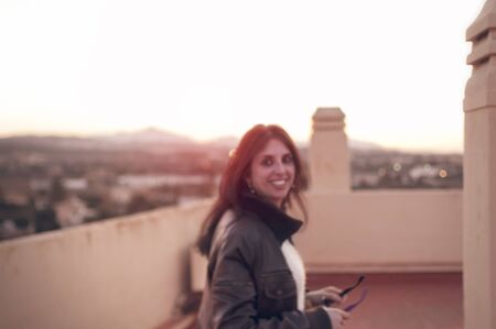 Portrait young woman on the roof at sunset on the beach a sunny spring day