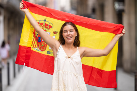 Happy smiling female Spanish supporter or fan displaying the national flag of Spain as she cheers on her country or team during a competitive event