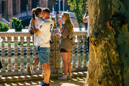 Seville Spain July 09, 2021 Tourists visiting Maria Luisa Park, the first urban park and one of the green lungs of Seville, emblematic city and capital of the Andalusia region
