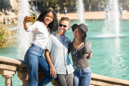Three young multiethnic tourists taking a selfie at a fountain in Barcelona