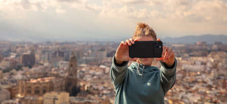 woman tourist taking a selphie in Malaga- Andalusia in Spain