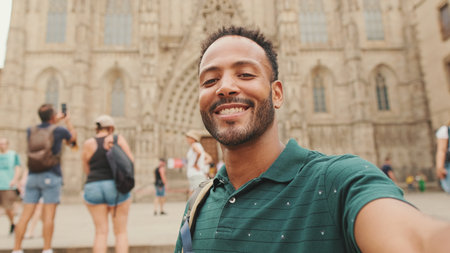 Close-up of young man tourist with backpack on his shoulder taking selfie on the Sagrada Familia background