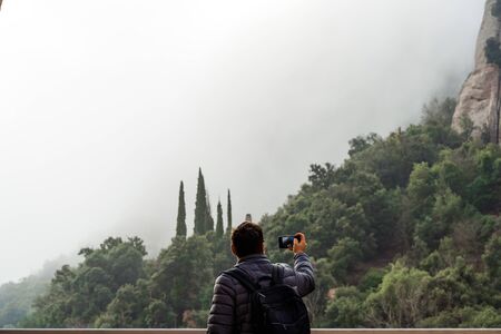 POV view of phone camera making photo of Montserrat Monastery in Spain