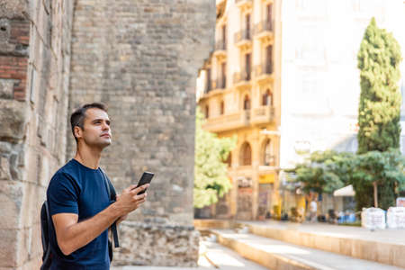 Young latin man tourist with mobile phone outdoors