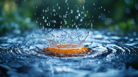 A splash of water is captured in a photo, with the water droplets falling from the sky. Concept of movement and energy, as the water droplets seem to be in motion
