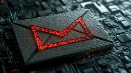 A striking visual of a digital circuit board showcasing a stylized email icon glowing in red. Ideal for illustrating communication technology themes.