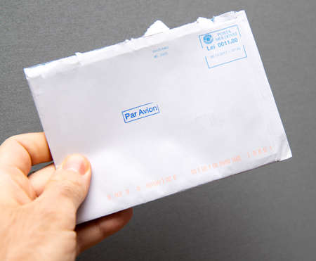 Paris, France - Jan 3, 2018: Man hand holding against gray background open letter with the stamp of Posta Moldovei Moldova Post office and price of 11 lei