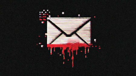A poisoned email icon drips with glitch pixels, conveying a message about dangerous attachments with a red alert theme.