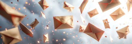A bunch of envelopes are flying through the air. The envelopes are all different sizes and shapes, and they are scattered all over the image. The scene gives off a sense of chaos and disarray