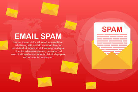 No spam. Spam Email Warning. Concept of virus, piracy, hacking and security. Envelope with spam. Vector stock illustration.