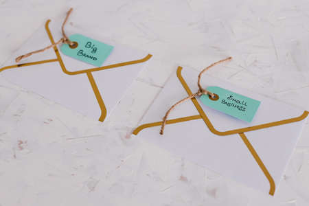 product tags with small business vs big brand texts over newsletter email envelopes, concept of customer behaviour and supporting small local businesses