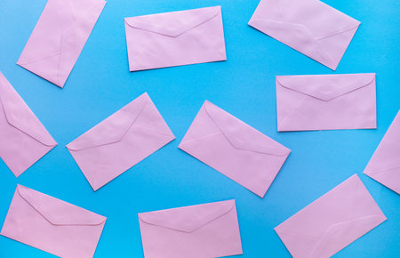 Heap of white e-mail at symbols on cyan background banner flat lay top view from above, contact us or communication concept, 3D illustration with copy space