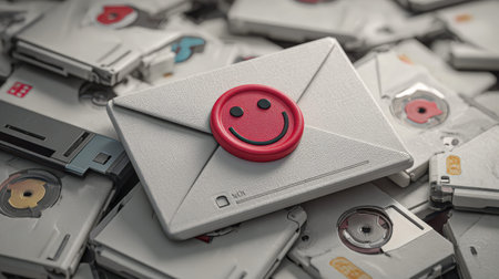Vintage Floppy Disks with Red Smiley Envelope Symbolizing Nostalgia and Communication in Retro Technology