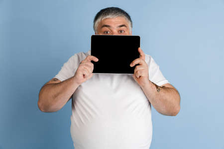 Handsome caucasian plus size male model isolated on blue studio background. Concept of inclusion, human emotions, facial expression