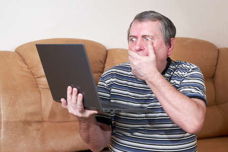 A man with a surprised face holds a laptop in his hands while sitting on couch