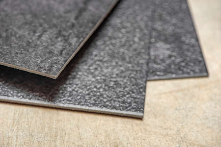 Vinyl PVC floor. The texture of the vinyl floor is black. Samples of vinyl covering, black pvc tiles on concrete floor before installation.