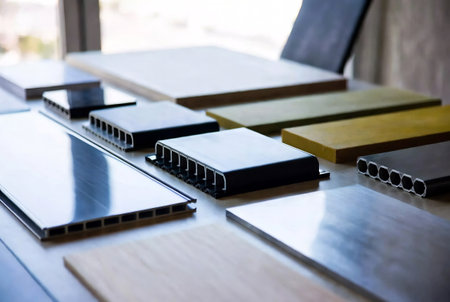 A collection of fabric swatches in diverse textures and colors is arranged on a design board, providing inspiration for interior design projects with copy space available