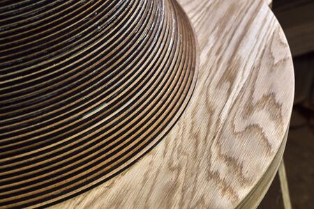 Joinery. Wooden coffee table in shape of circle being produced in workshop