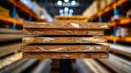 Stacks of OSB sheets for sale in a hardware store warehouse.