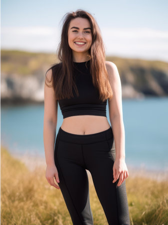 Smiling young woman in black sportswear standing on the beach
