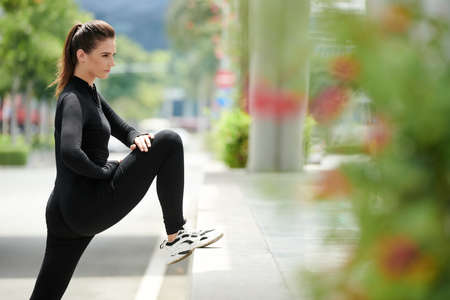 Determined young sportswoman stretching legs after run to keep muscles supple and prevent them from shortening