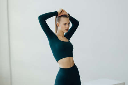 Slim beautiful woman posing on camera dressed in sportswear