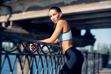 Portrait of attractive sports woman with sexy butt and hips posing outdoors. Beautiful young fitness girl in stylish sportswear standing on bridge. Confident woman with sexy ass, booty in leggings