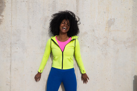 Beautiful young Afro-American woman in bright green and pink sportswear on a gray concrete wall texture background. Woman makes different expressions. Laughing, serious, happy, sad, thinking