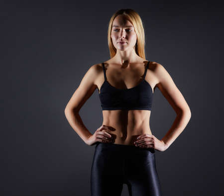 Sportive blonde girl on the background of the black wall of the gym. Body relief and hair sweep