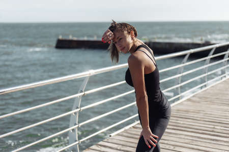 Attractive tired woman with perfect body after training on the beach on a bright sunny day. Healthy lifestyle concept