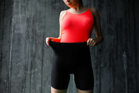 A girl in a sports uniform stands in leggings and pulls them aside showing success in losing weight in the gym.